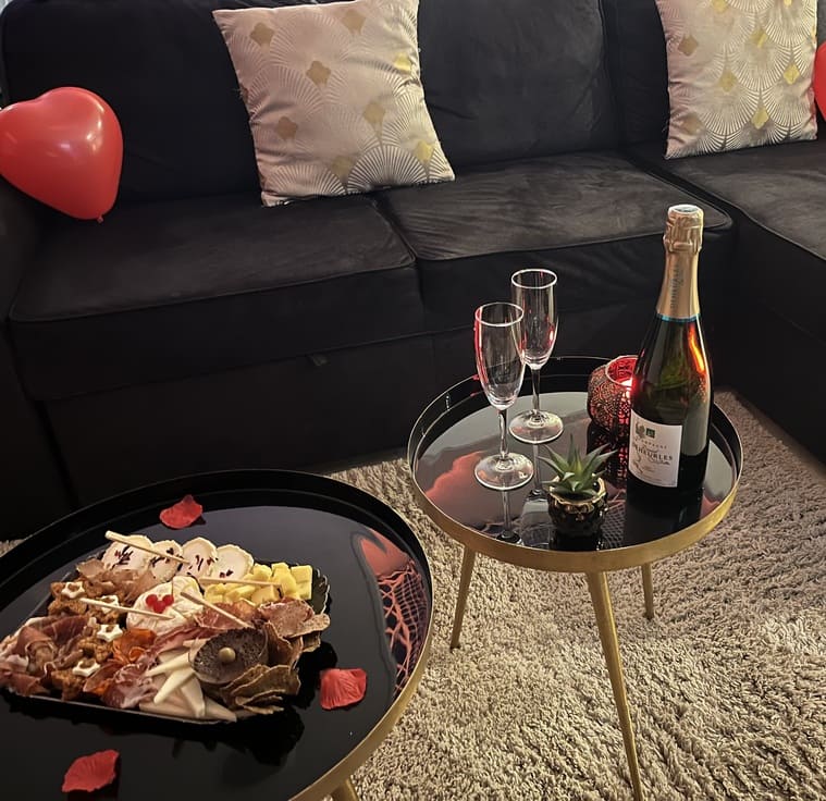 Un grand salon équipé d’un poêle réchauffe déjà l’ambiance à la douceur de ses flammes et donne le ton pour votre soirée romantique.