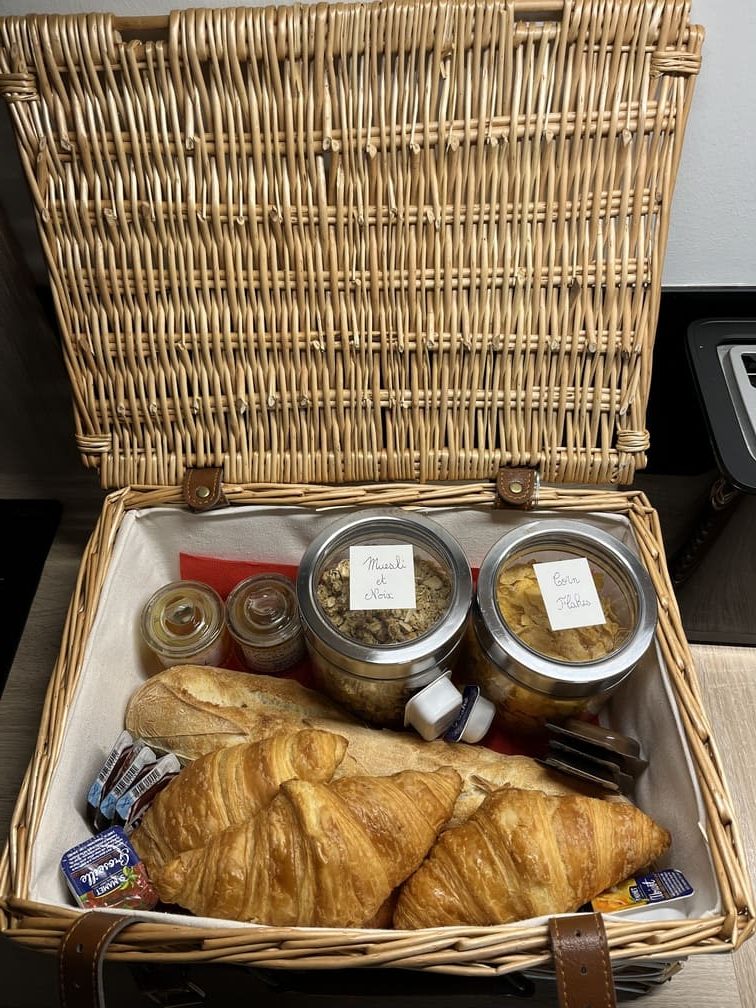 Petit-déjeuner complet, croissants, petits pains (chocolatines), baguette, yaourts, céréales, jus de fruits…