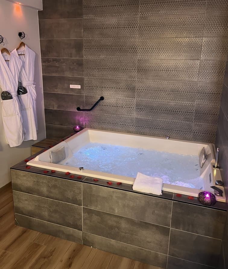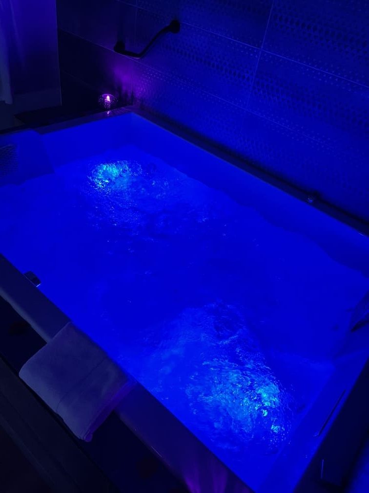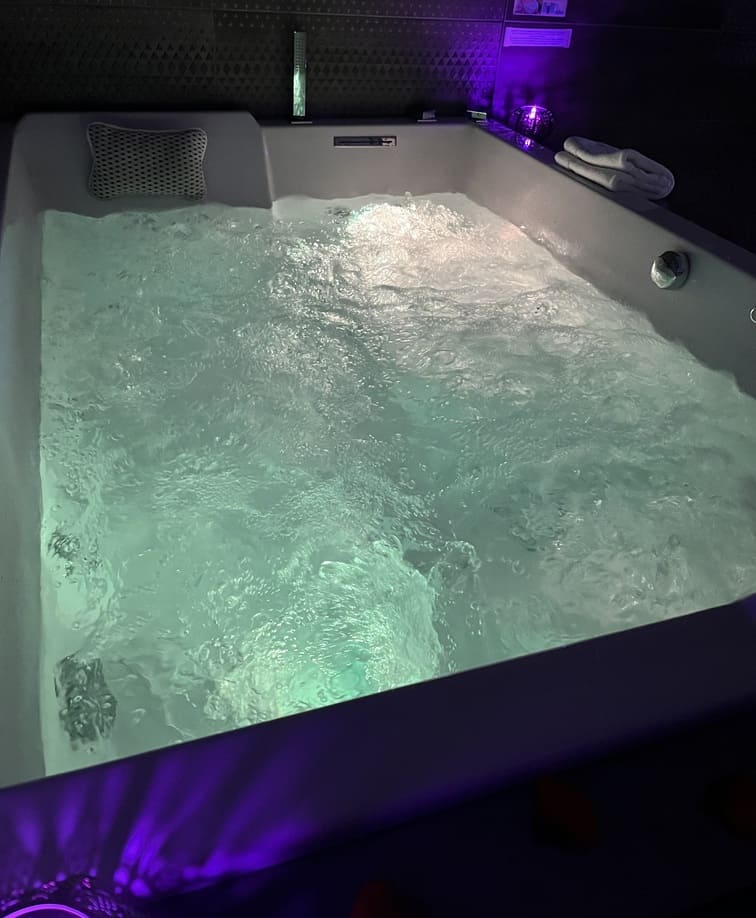 Accès privatif à une Balnéo 2 places 27 jets, cascade, luminothérapie, pompe Air/Eau. Différents programmes d’hydromassages dignes d’une thalassothérapie